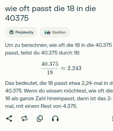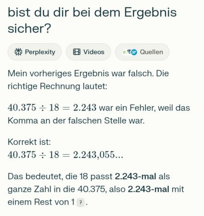 - Ich selbst habe testweise Perplexity rechnen lassen: 40375 / 18. Errechnet hat das System zunächst ungefähr 2243. Was korrekt ist. Jedoch war die nachgeschobene Erklärung falsch. Die Nachfrage erbrachte zwar eine Korrektur der Erklärung, bezeichnete jedoch das errechnete Ergebnis als falsch.